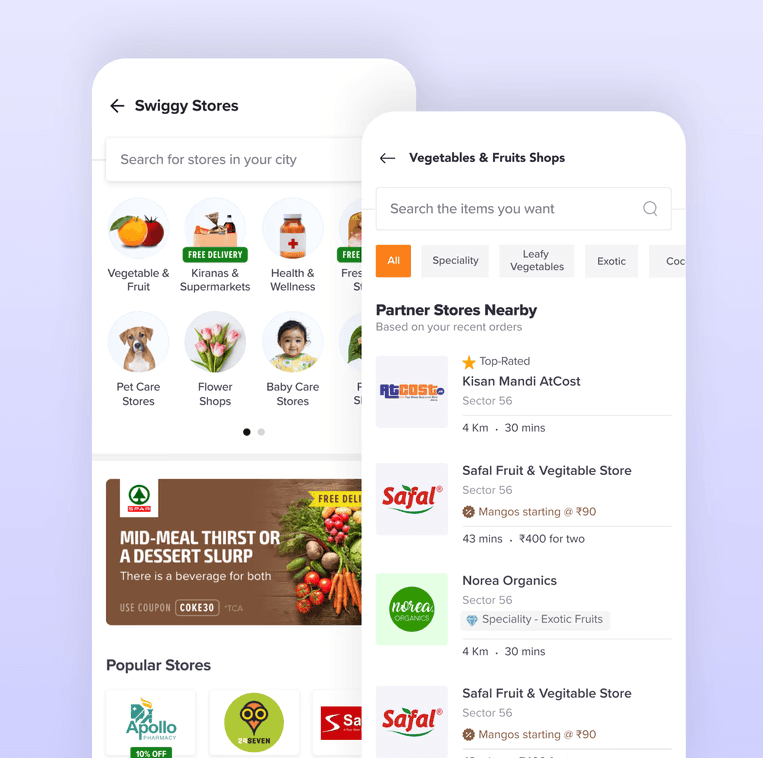 Before Instamart, I led the design and launch of Swiggy Stores, a market- place for supermarkets and local stores. We faced difficult challenges with product accuracy and inventory, causing cancellations and poor customer perception of Stores.